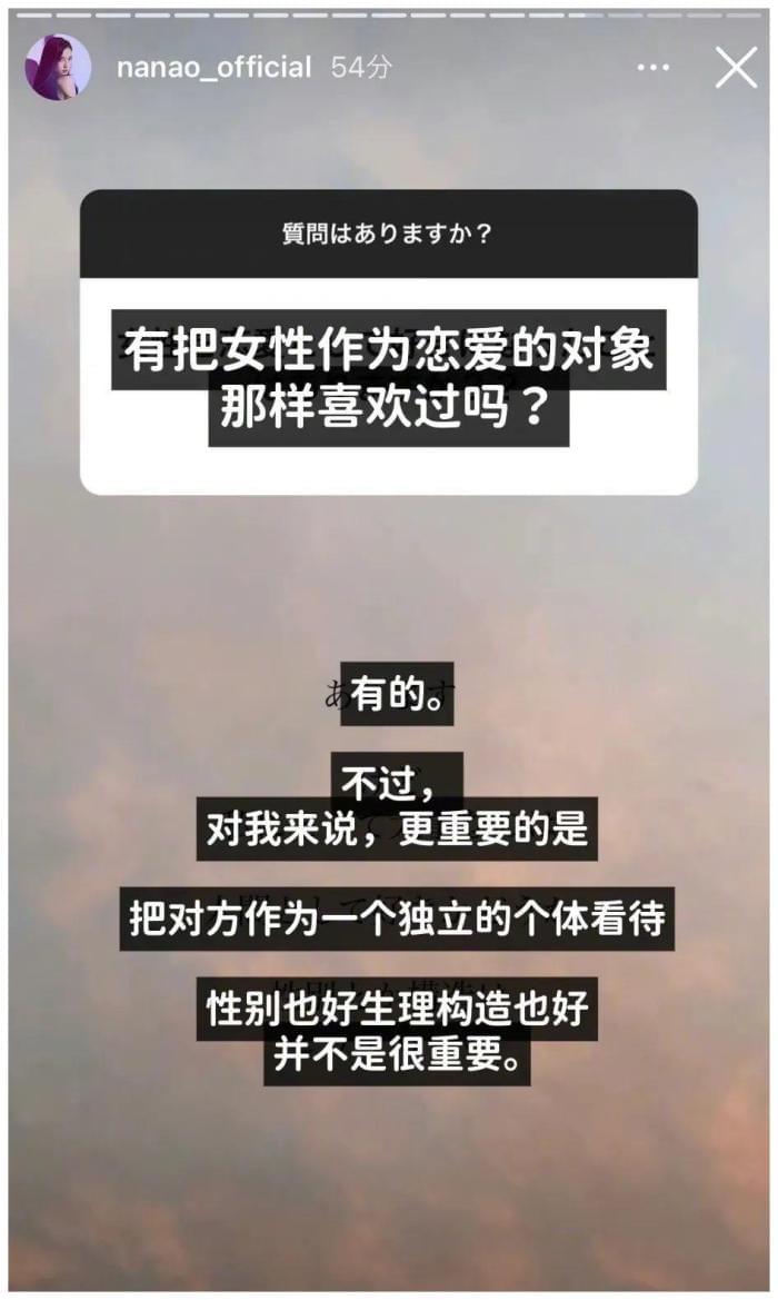 近日菜菜绪在社交平台上回答记者问,有把女性作为恋爱的对象那样喜欢过。她说,把对方当成一个独立的个体看待,性别也好生理结构也好,并不是很重要。