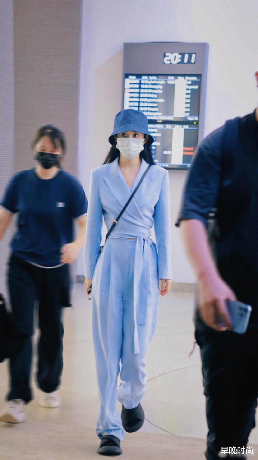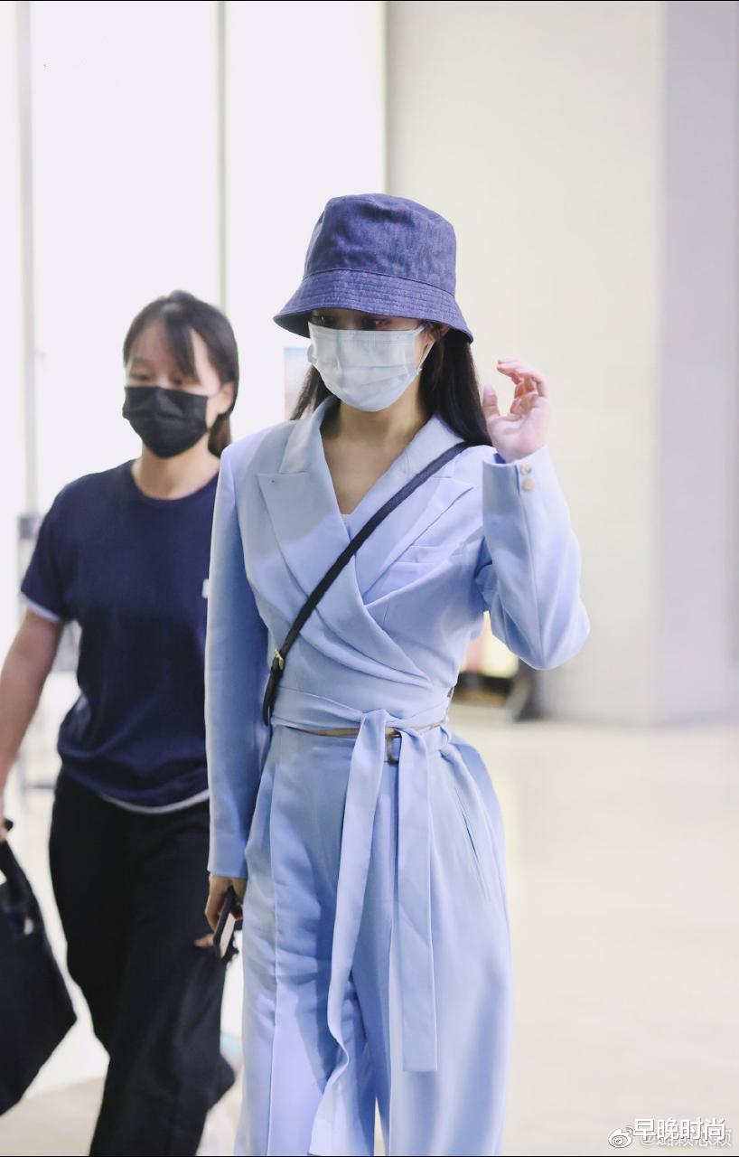 回到这次的造型也很有看点,整体是天蓝色基调,浅色系适合夏天,不仔细看会以为是连体裤,其实是露腰套装。上衣和裤子衔接得比较好,几乎看不到露腰了,上衣是西装的设计,经典的翻驳领,很好地修饰了脖颈。但西装版型属于又紧又短的风格,没有竖排扣,而是围裹+绑带的设计,让平时干练拘谨的西装瞬间变得时髦又飘逸。