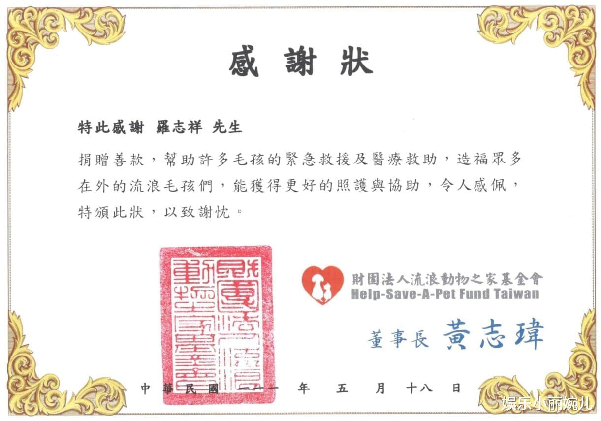 此外,虽然罗志祥近期忙着准备这个月在台北小巨蛋的演唱会,但他忙碌之余也不忘做善事,近日流浪动物之家基金会就透露,他们收到一笔捐款者为罗志祥的善心捐款“某天当基金会按照惯例要去刷本子时,突然看到了一名捐款者罗志祥先生的名字。