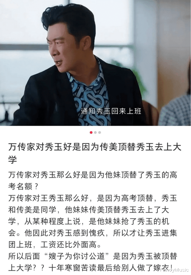 不仅如此,秀玉之所以能进万家集团工作,实际上是因为万书记的女儿传美顶替了秀玉的大学名额,万家内心愧疚,这才让高秀玉进了万家集团。