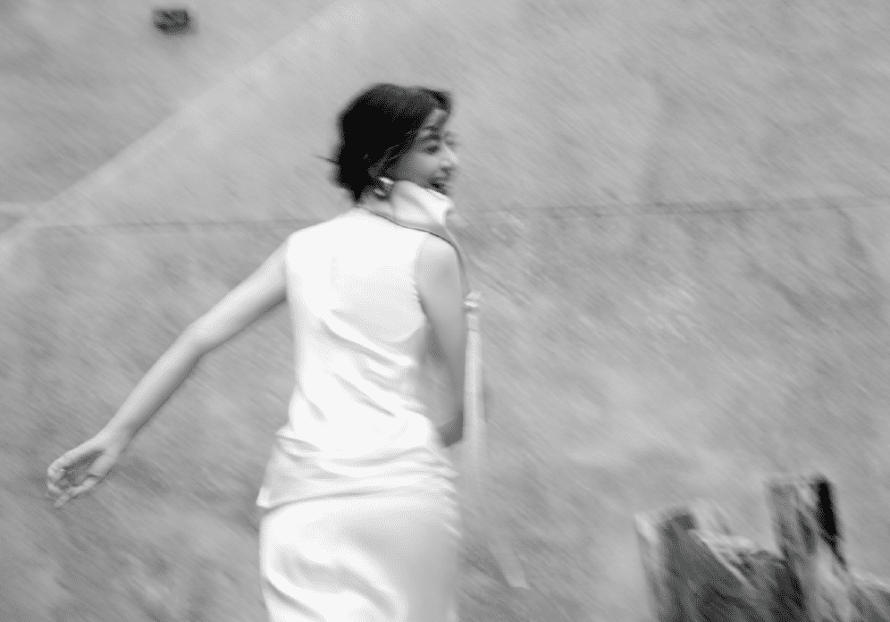 这张图片中,高圆圆整个人都在运动,她笑容灿烂地奔跑,整个镜头也跟着晃动起来。