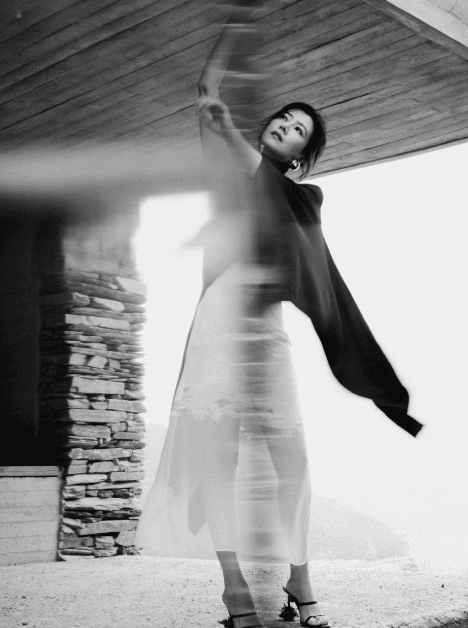 这组的照片里的高圆圆,穿着半透明的裙子,身披黑色的围巾,翩翩起舞,御姐感十足。