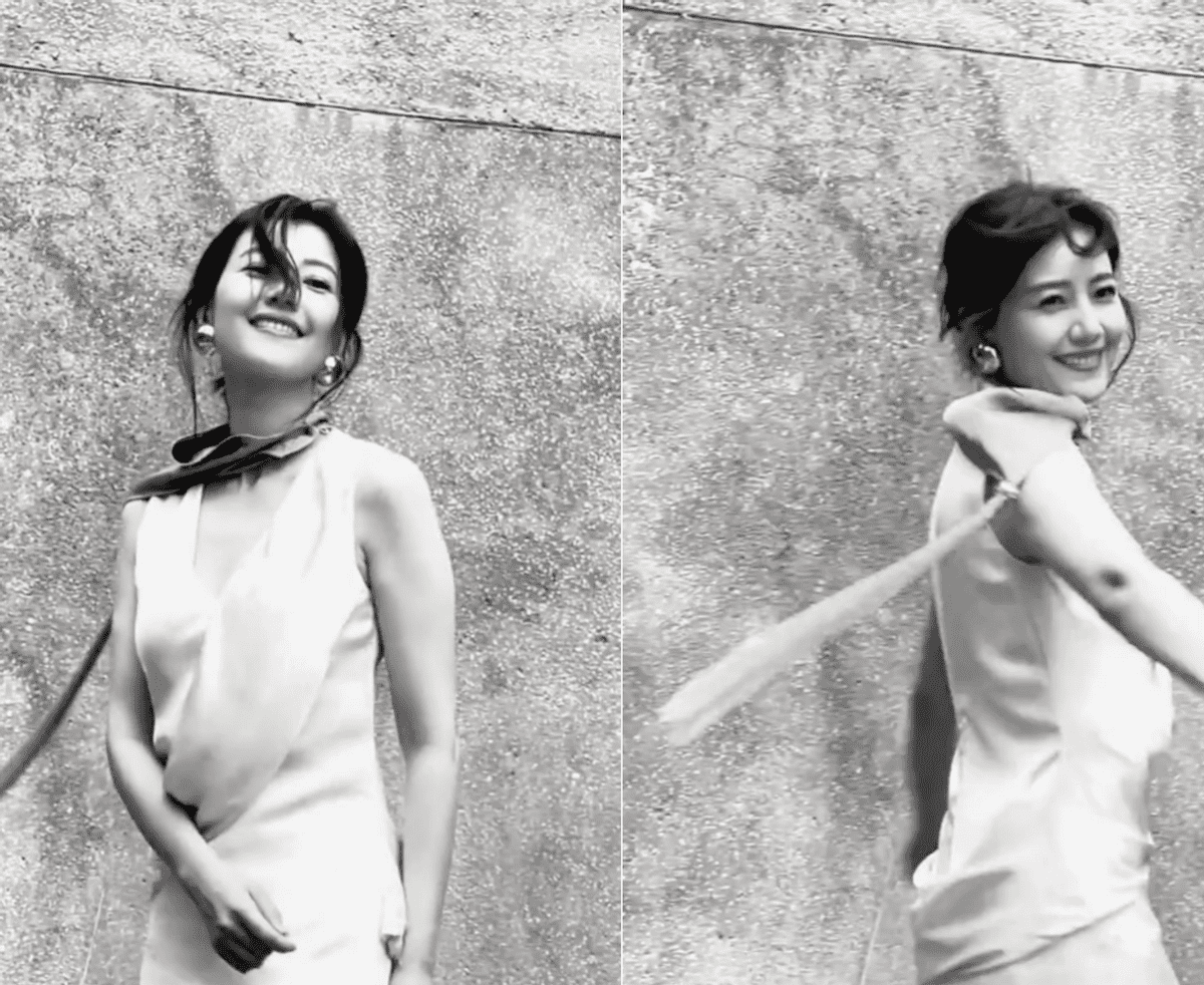 高圆圆的脸上笑靥如花,整个身体向前转动了起来,眼睛又转回来看镜头,韵味十足。