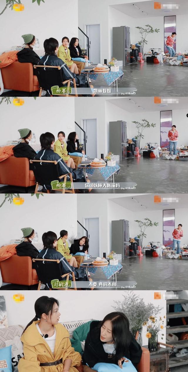 杨幂先说了,因为凯丽姐打呼会影响到敏涛姐,所以问敏涛要不要和其他人睡一起,刘敏涛拒绝了;杨幂又说,“要不敏涛姐你和麦麦(赵今麦)睡一个房间,”刘敏涛又拒绝了;麦麦就直接建议让敏涛姐一个人睡一个房间,刘敏涛依旧是拒绝。
