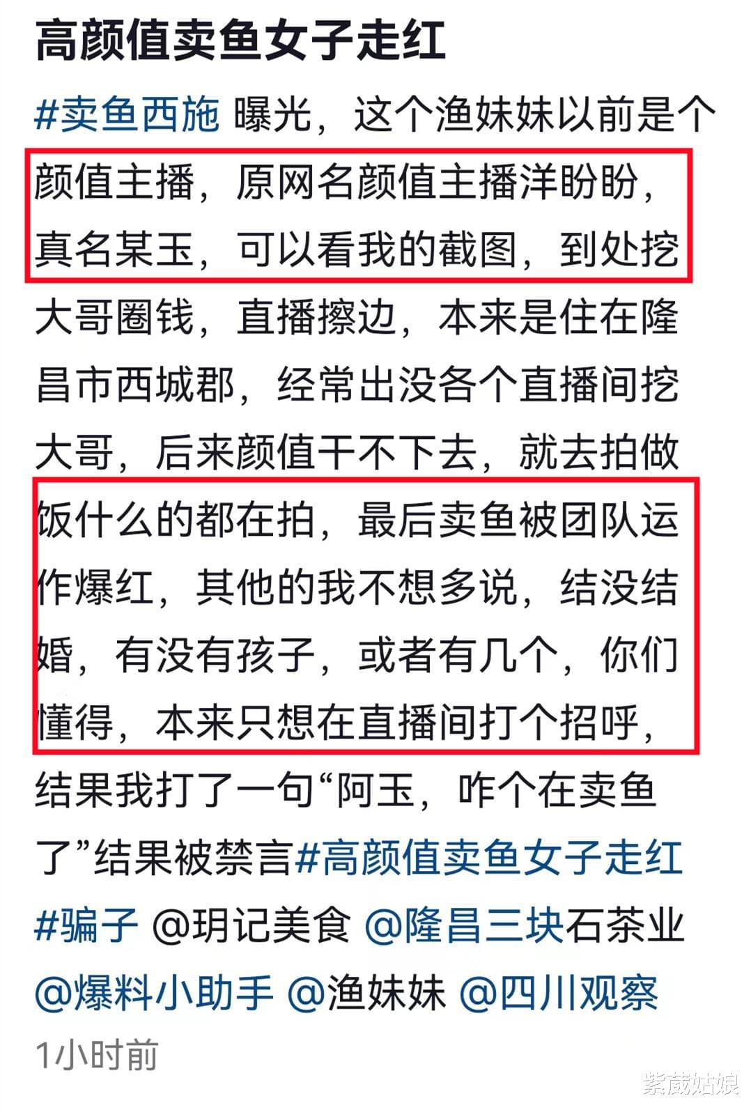重点是,知情人还透露,这位卖鱼的小姐姐,早就结婚了,还有孩子;说句实诚话,已婚妇女不丢人,关键是不能欺骗观众啊。