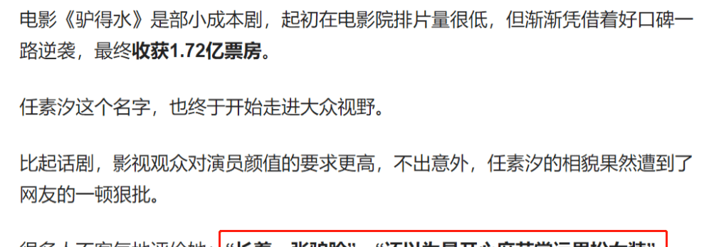 就是这样长相的任素汐,和娱乐圈的其他女主角相比,是“格格不入”的,因此,想成为获得导演和观众认可的女主演是需要走很多路的。