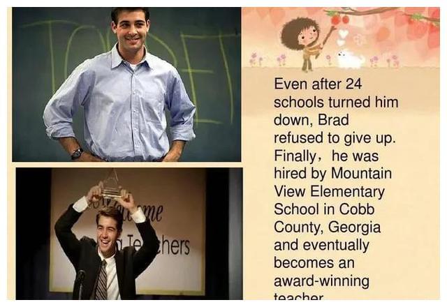 他被残酷的现实打倒了吗?并没有,在他的字典里,从来没有“妥协”两个字。他又重新规划了求职计划。所有的学校都开学了,各学校招聘也接近尾声,科恩开始消沉了。就在这时有一家学校向科恩抛来了橄榄枝。校长和副校长都和蔼可亲,跟科恩谈了两个小时的教育理念。