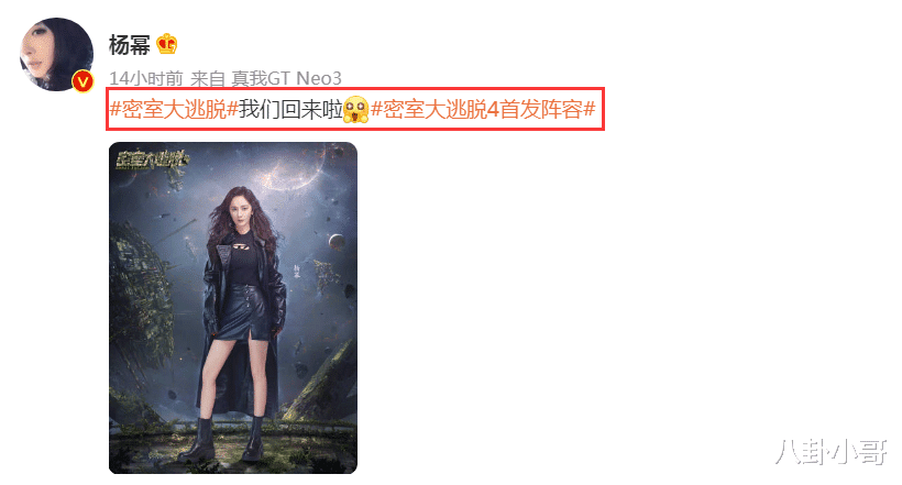 这一季杨幂也通过个人社交平台发文官宣了《密室大逃脱》第四季,配文写道:“我们回来啦”,可以看出杨幂还是非常期待这档节目的。