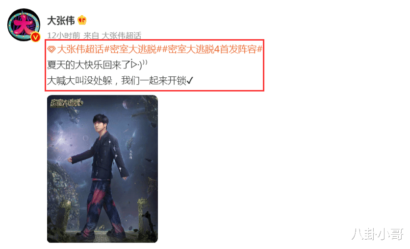 这次,大张伟再次加盟《密室大逃脱》第四季,他也通过个人社交平台发文写道:“夏天的大快乐回来了,大喊大叫没处躲,我们一起来开锁。”看来通过两季的适应,大张伟也逐渐找到了这档节目的密钥,能够胜利逃脱的关键是要解开所有的谜团,大喊大叫是没有用的。