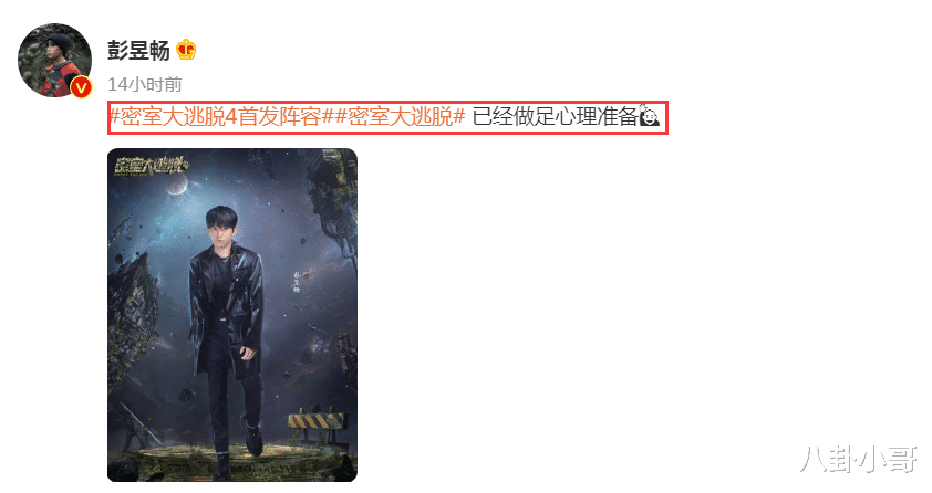 另外一位新成员彭昱畅,作为湖南卫视综艺节目的常客,曾担任多档综艺节目的常驻嘉宾,在《向往的生活》中,彭昱畅是一位非常好的小伙子,什么苦活累活都抢着干,简直就是一个苦力担当,胆子也很大,什么事情都敢尝试,这次加盟《密逃》第四季,他却有些害怕,配文写道:“已经做足心理准备”,