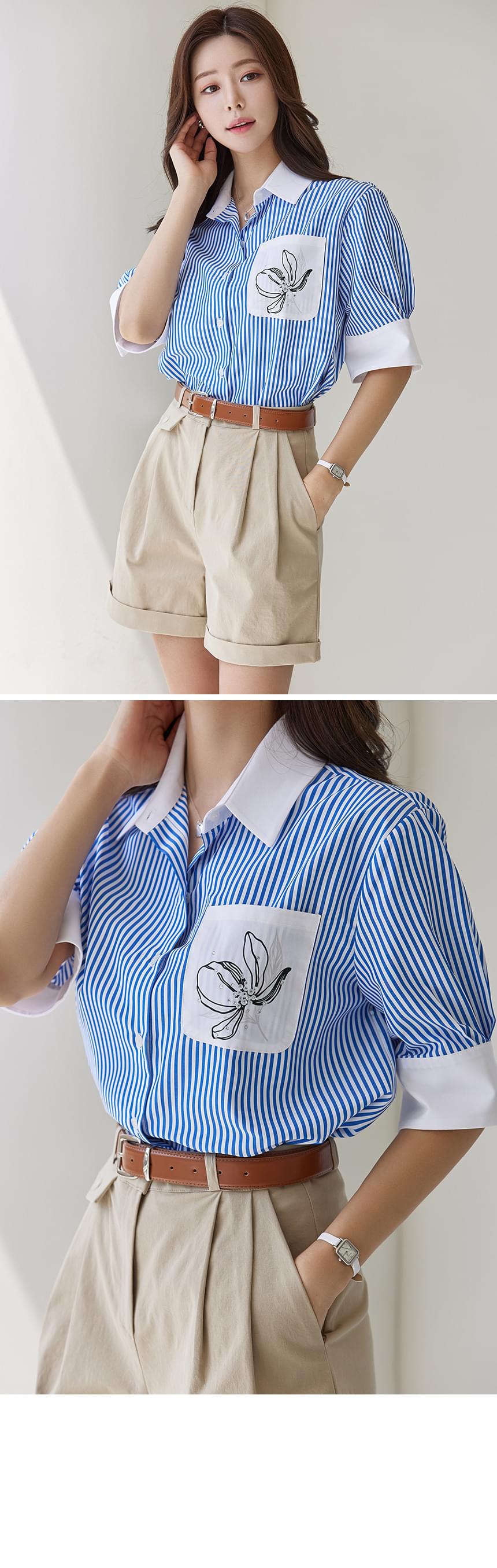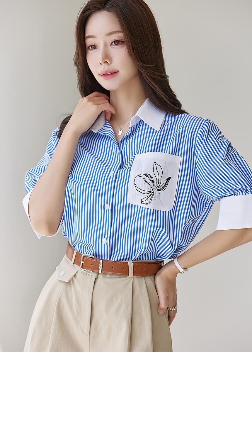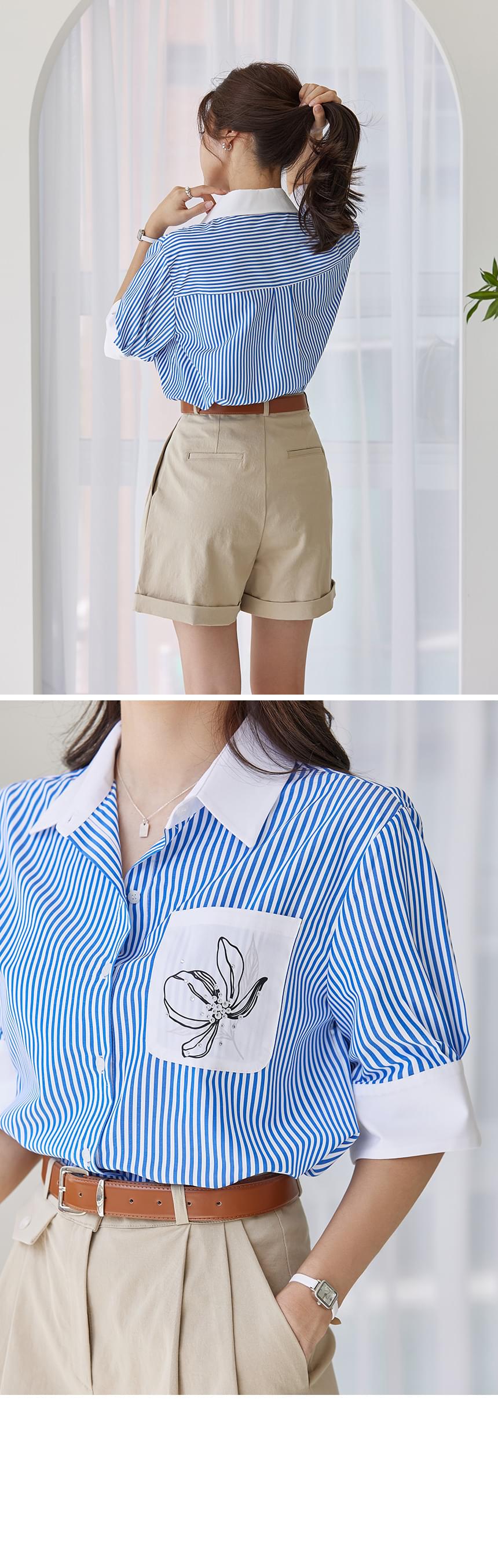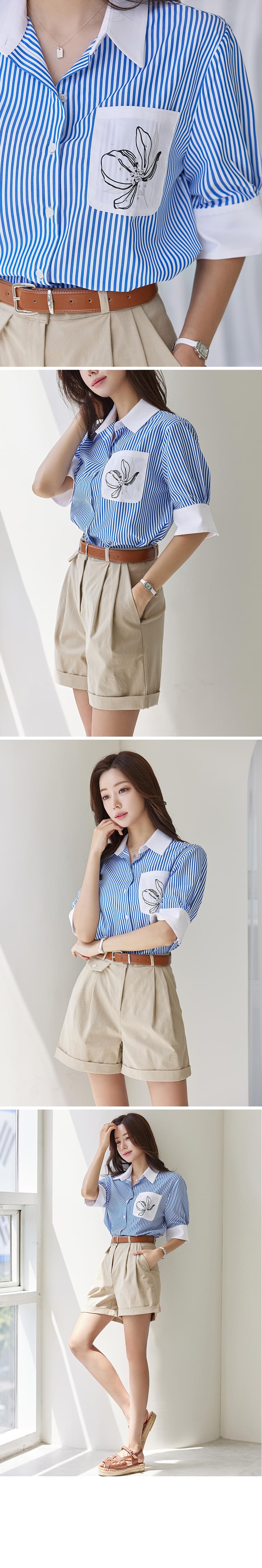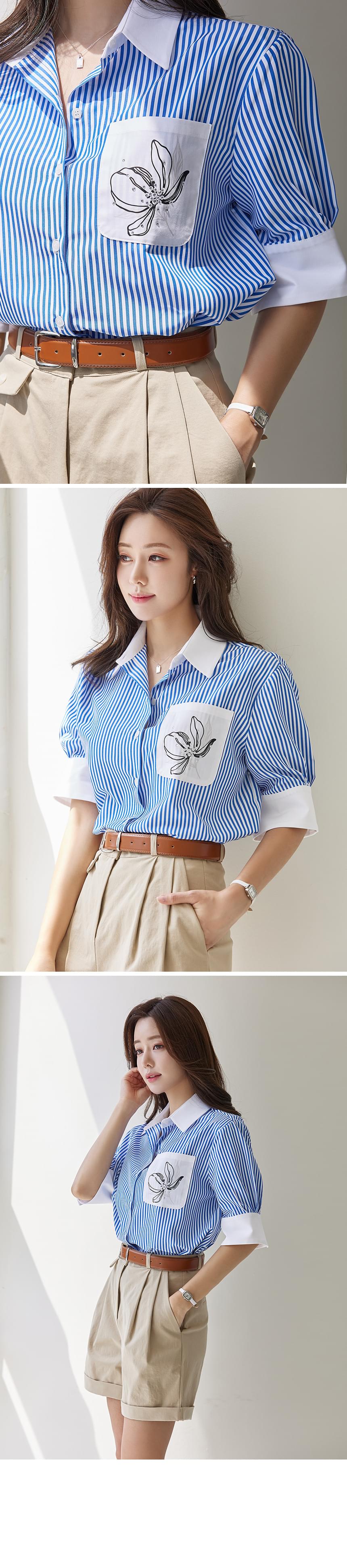 清爽清凉的蓝色条纹图案轻薄衬衫,前部侧袋饰有排花印花和立体装饰,稍微含蓄了一点!