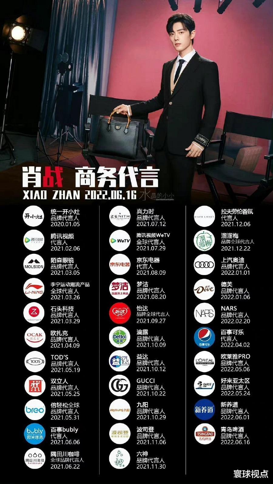众所周知,肖战已经与全球三大高奢品牌合作,分别是意大利TOD’S、真力时和古驰,另有国内知名品牌的代言接近三十个。在短短一年多的时间内,这一成绩非常超前,使其个人影响力和商业价值得到印证,继而收获了更多品牌方的橄榄枝。