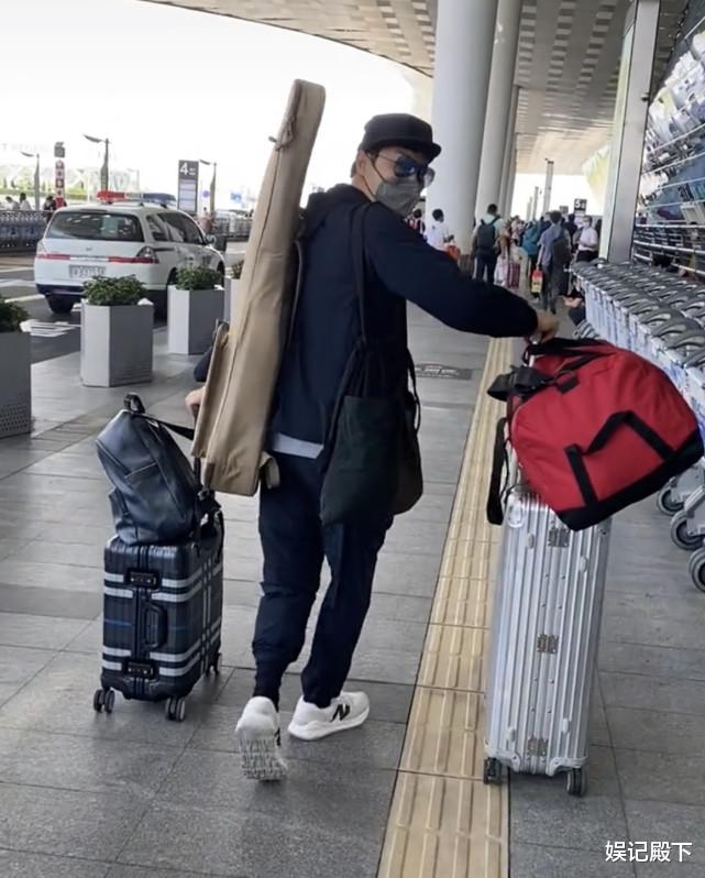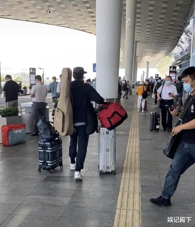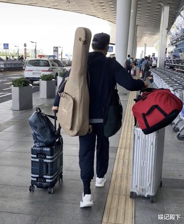 画面中的谭耀文穿着普通,左手推着一个行李箱,上面放着一个双肩包,右手推着一个大行李箱,上面同样放着一个超大的行李包,他的右肩膀上背着一个深蓝色帆布包,左肩膀还挂着一把大吉他,这么多的行李都是他自己一个人在拿!