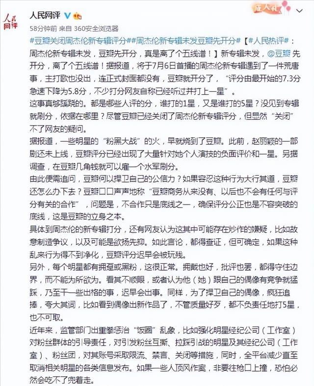 人民网指出,主打歌还没有出来,连专辑封面都没有的情况下,竟然有这么多人打出一星差评,这事太蹊跷,豆瓣可以关闭评分,但无法关闭网友的疑问。