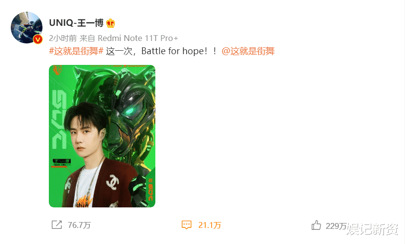 7月5日,王一博在自己的社交平台晒出《这!就是街舞5》的宣传海报,并配文:这一次,Battle for hope!(为希望而战!)这是官宣参加第五季了。