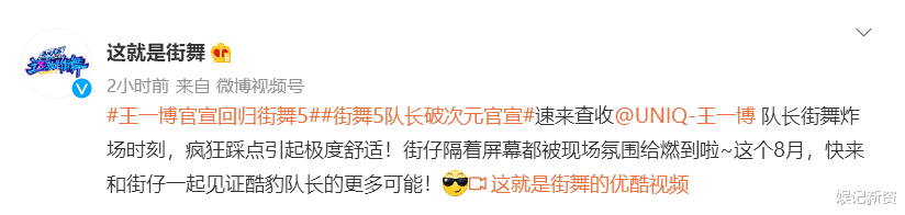 而在王一博官宣之后,《这!就是街舞》的官方微博也是第一时间转发了该动态,并表示以纯粹热爱,秉希望前行,欢迎王一博队长回归街舞5,这个夏天和一博队长一起见证街舞力量,共赴街舞宇宙!