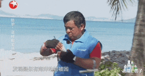 贾乃亮和黄明昊,在岸上正学习如何剪渔网呢,突然就接到发现被困动物的紧急救援任务。
