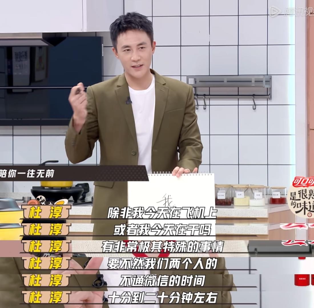 即便是在外工作的时候,杜淳也会不停地跟老婆报备自己的一举一动。除了洗澡和坐飞机的时间,两个人几乎无时无刻都在聊天!