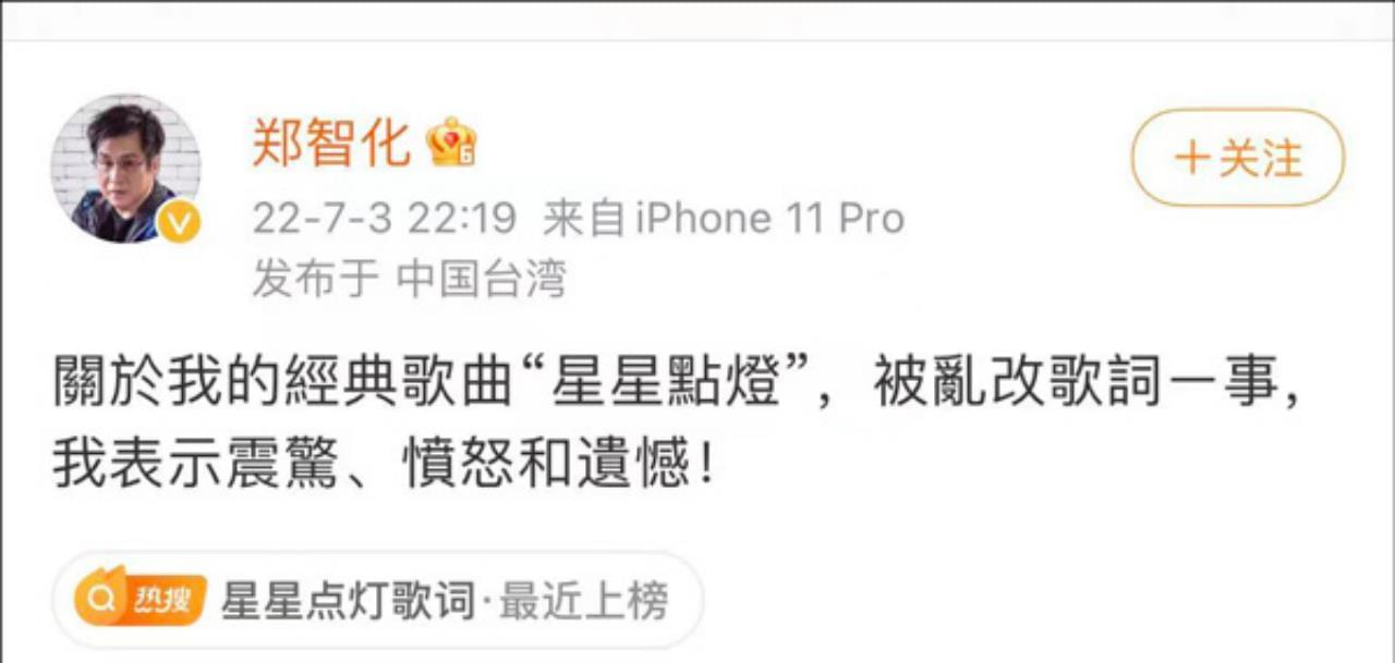 瞬间,掀起7080后人的回忆杀,在她们凭借这首歌曲拿到第一的时候,细心的网友发现,她们竟然把这首歌的歌词给修改了,这一件事,也引起郑智化的不满,他发文表示,对于我的经典歌曲《星星点灯》,被乱改歌词一事,我表示震惊,愤怒和遗憾。