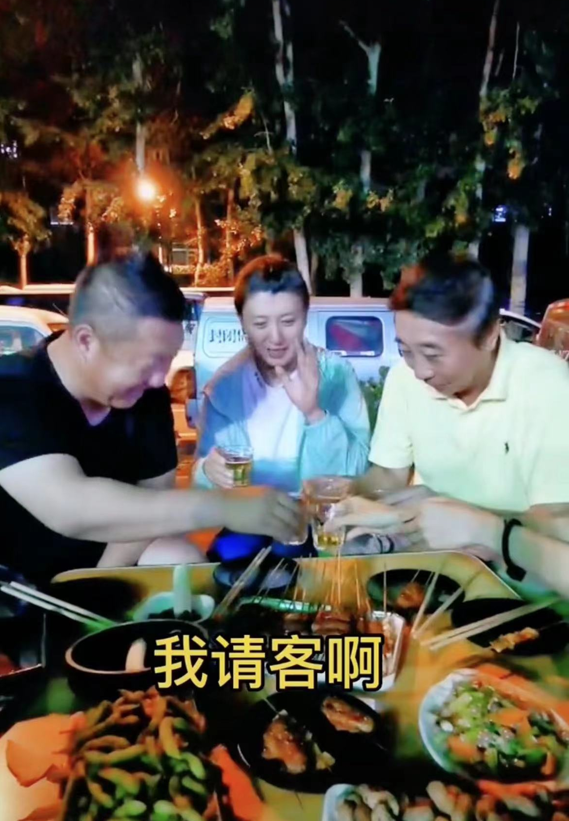 吃烤串怎么能少得了啤酒呢?一行人举杯喝个不停,冯巩还代表大家为寿星送上了真挚的祝福,气氛十分愉快。
