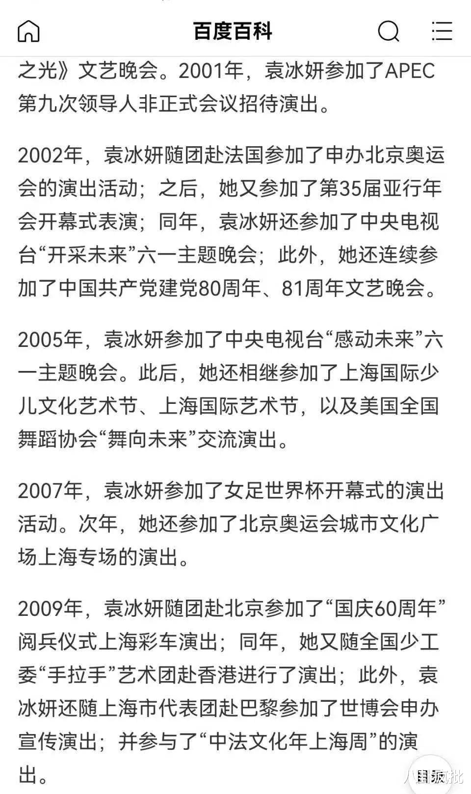 只能说袁冰妍确实有点来头(已经有网友想到她之前被爆煤老板金丝雀的事了,毕竟要是没外部助力的话,她的事哪儿能轻拿轻放),02年就(10岁)随团赴法国参加申办北京奥运会的演出活动,还参加了第35届亚行年会开幕式表演,从00年开始到09年参加的都是全国或国际级别的活动,确实不止是普通公W员家庭那么简单。