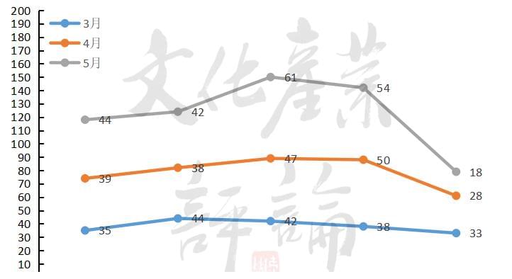 △2017-2022年3-5月每月上映新片数量上半年181天里,单日票房低于3000万的有74天,其中影院营业率低于80%的有57天,没有新片上映的天数达到了64。“影院关闭-影片撤档-无片可看-票房大幅下滑”是今年疫情带来的连锁反应,这比2020年直接停业的“危害”更大。
