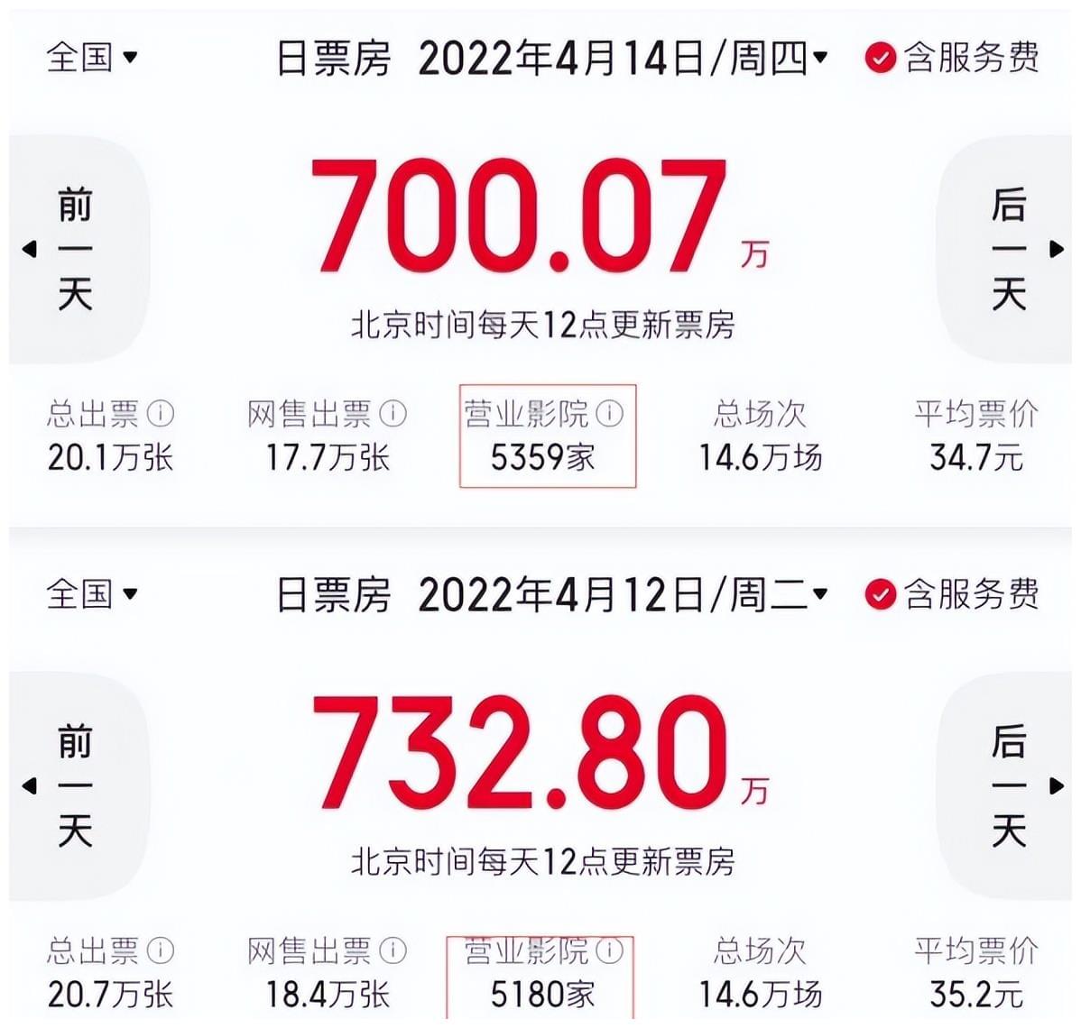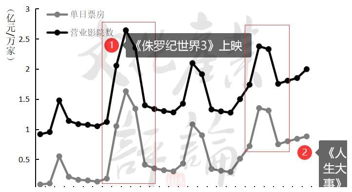 △《人生大事》上映后单日票房走势这算是为上半年的电影市场划下了不错的句号。上半年,电影市场经历了高开低走再到缓慢回升的过程。自春节档取得了历史第二高票房之后,市场渐渐冷清。3月中旬开始,工作日票房低于2000万成为常态。清明节之后创出了新低,4月12-14日这三天,是上半年单日票房的最低值——不足750万,营业影院平均单日首日5000元左右。整个上半年单日票房不足千万的有27天,这将近一个月的时间票房只有2.22亿。影院营业数量也在不断下降,3月21开始数量低于6000家。4月12日营业影院5180家,营业率只有50%左右,是上半年的最低值。