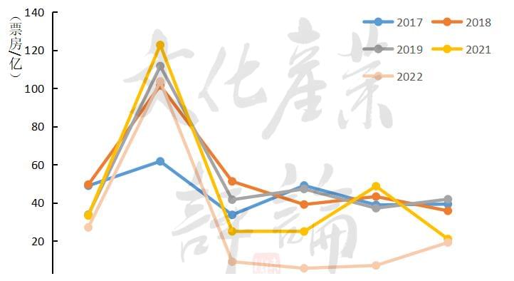△2017-2022年上半年票房和放映场次单月票房中,2月最高,达到103.56亿,略高于2018年同期(101.47亿),排在2021年和2019年之后,也是上半年唯一没有大幅度倒退的月份。3、4、5月票房均低于10亿,其中4月最低,为5.66亿。除2020年之外,上一次单月票房低于10亿还是2012年的3月和11月。上半年票房减少,主要出现在3月、4月和5月。