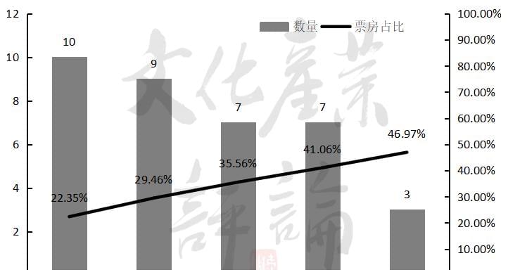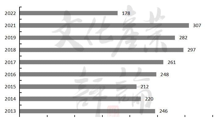 △2013-2022年上半年上映影片数量《长津湖之水门桥》《这个杀手不太冷》《奇迹·笨小孩》是上半年的票房前三,均出自春节档。它们也是上半年唯一破10亿的影片,该指标在2017-2021年上半年分别是10部、9部、7部和7部。Top3票房合计80.69亿,约占上半年总票房的46.97%,占比为2017年以来最高。过5亿的影片9部,除《穿越寒冬拥抱你》之外,均在2022年上映,且6部来自春节档。这些都表明今年上半年,来自春节以外的票房在总比例中进一步缩小。票房过亿影片27部,其中《穿越寒冬拥抱你》《反贪风暴5》《误杀2》《一年为单位的恋爱》《爱情神话》等5部是去年12月上映。