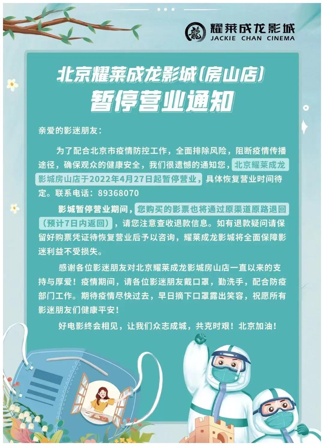 △北京房山耀莱成龙影城停业通知北京和上海一直是全国最大的两个票仓城市。统计2017-2021年3-6月两地的票房,可以发现,这几个月中它们在全国票房的占比是高于10%的。那么,今年北京和上海的停业,直接带走了至少10%的票房。若以上一年为基数,约等于11.96亿票房。