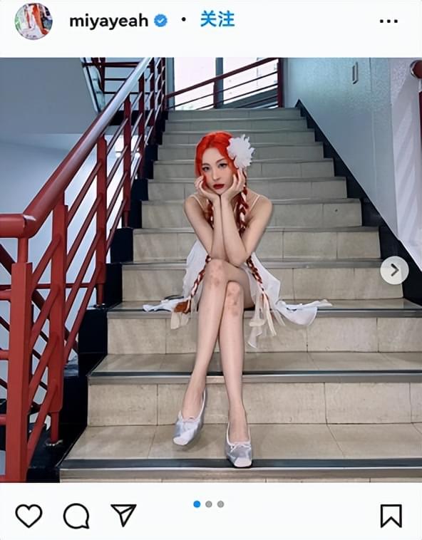 只见宣美坐在楼梯上,身穿白色吊带短裙,十分野性。宣美嘟起嘴,俏皮地握住自己的两条麻花辫往两边翘开,一边翘着腿更显得宣美双腿修长。在宣美白皙肤色的衬托下,宣美膝盖上、脚腕上的伤口也尤为明显,灰褐色的疤印几乎布满了宣美的整个膝盖骨。