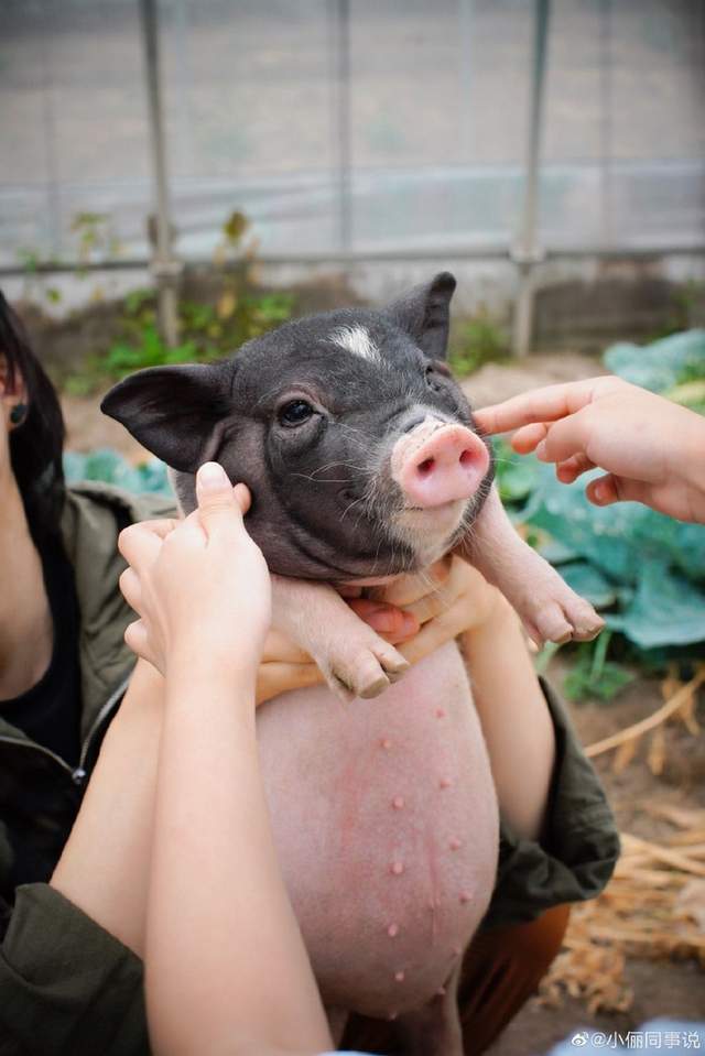 又见孙俪捧起小香猪给友人看。看小香猪这圆滚滚的小身体和无辜的眼神,孙俪友人也忍不住上手戳了下小香猪的脸蛋,小香猪一动不动,伸直着两条前腿,看上去非常可爱。