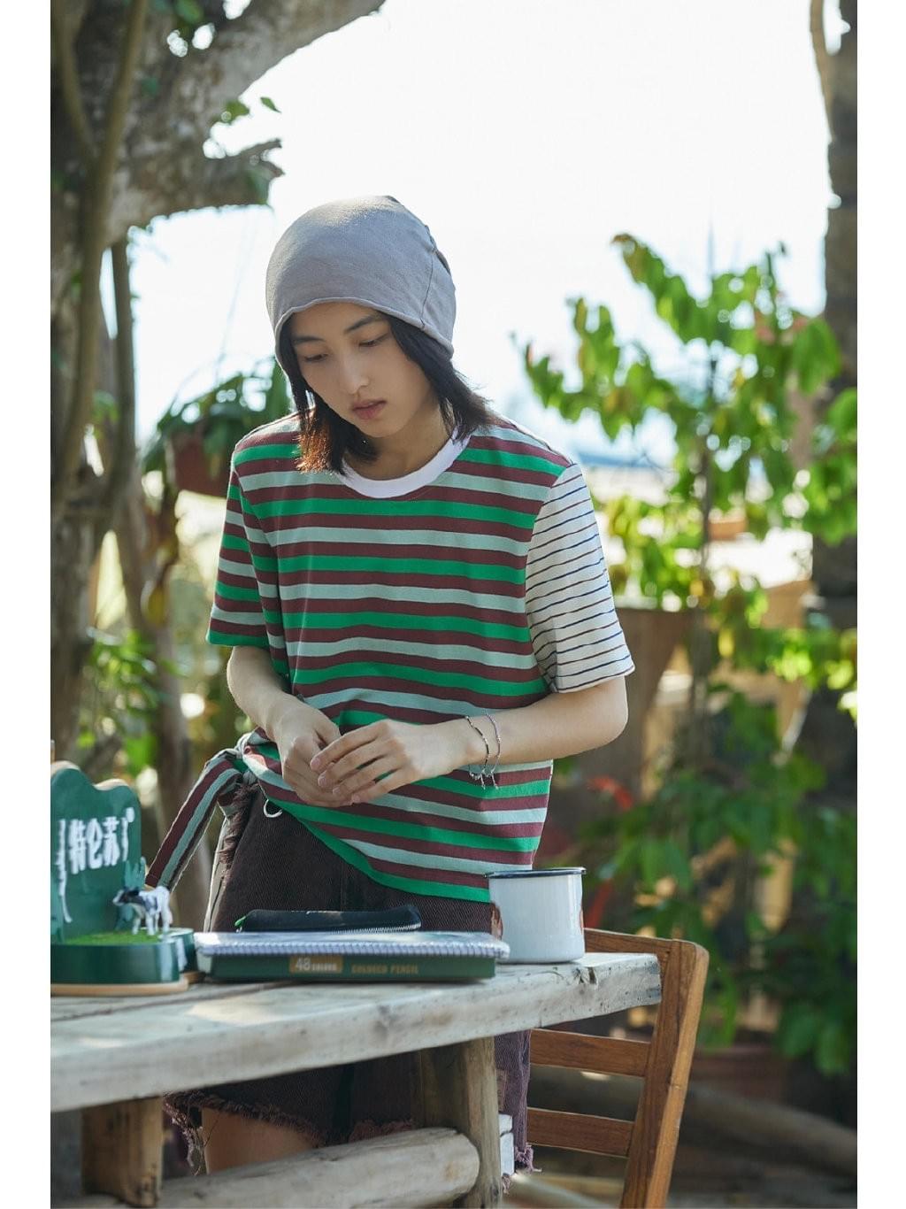 条纹款式的休闲单品,也是很有代表性的文艺少年感单品,同时在条纹元素的配色下,深浅不一,色彩浓郁度不同的色调下,其时尚风格也会有所偏离,像复古绿色与砖红色的不规则极简条纹半袖,就是很有时尚吸引力的款式,搭配起来便可以轻松凹造型。