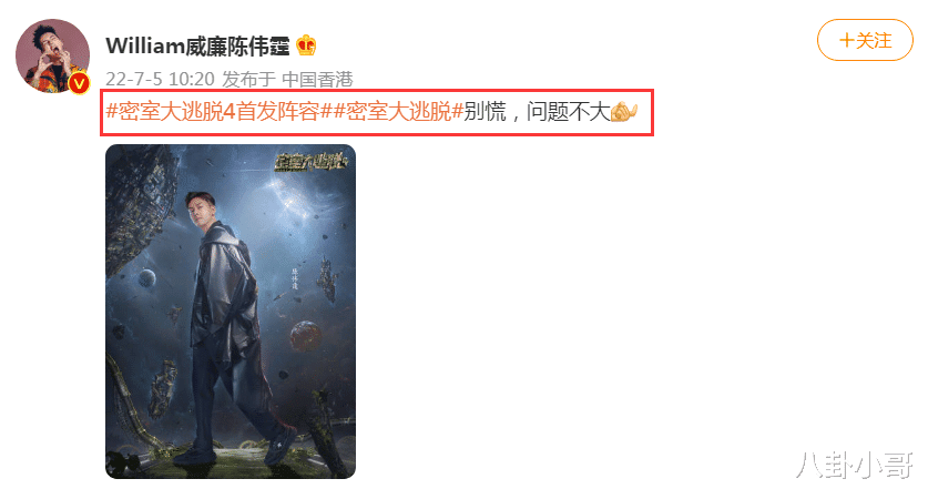 同时,他也在个人社交平台上官宣了自己加盟的好消息,并配文写道:“别慌,问题不大”,从这个文案中可以看到,陈伟霆对自己还是非常有信心的,能够成功逃脱节目组的安排,而网友却在底下留言写道:“不慌,你负责动手还是动脑”,也有网友戏称陈伟霆为“最强坦克”,毕竟在之前的影视剧中,陈伟霆也曾扮演过“张大佛爷”,什么恐怖场面没见过,这种小场面应该没有什么问题。