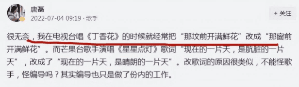 在郑智化歌词被改的事情发酵之后,歌手唐磊在社交平台上对其进行了声援,同时也表达了自己的无奈!