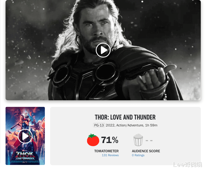 漫威新片《雷神4:爱与雷霆》(Thor: Love and Thunder)影评网站开分!截至目前,烂番茄新鲜度71%,131评论,93鲜,38烂,MetaCritic开分63。影评人对于该片的评价呈现两极分化。