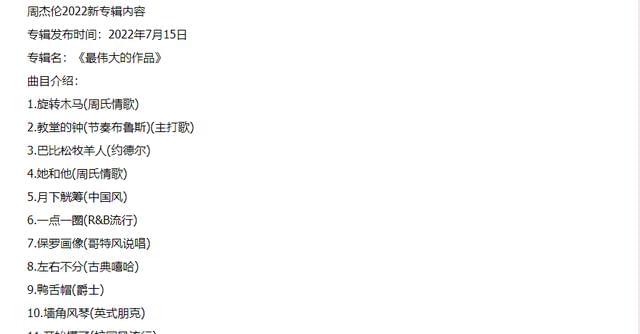 现在这首先导曲《最伟大的作品》讨论也是相对热闹的,但比较残忍的事情这首歌曲只要熟悉周杰伦的歌曲的都知道,不能说差但和经典作品不能比较。当然之前网络公布的这张专辑一共有12首歌曲,大家还有很多歌曲可以期待。