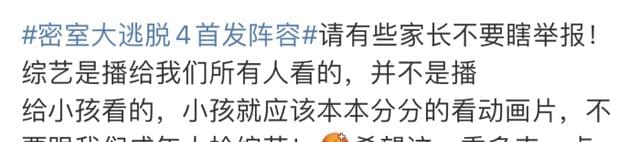 正常来说,《密逃4》阵容强大,节目效果不愁,节目粉应该非常高兴。但翻看评论区,大批节目粉却操碎了心,早早就喊话各位家长看好自己的小孩,不要因为自家小孩害怕就举报节目。