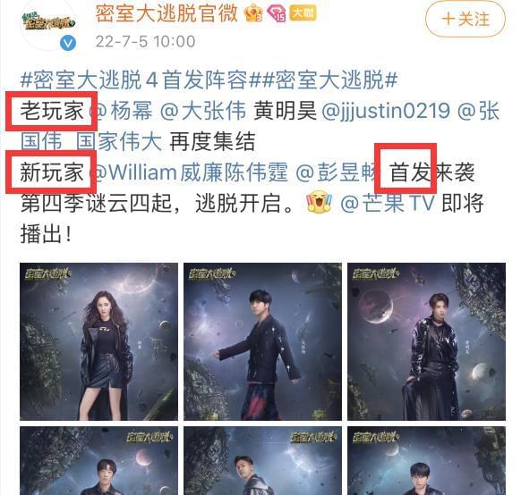 继频繁因为路透登上热搜后,《密室大逃脱4》最终正式官宣了,除了发布了一张概念海报外,还陆续宣布了本季6位首发阵容,想必离开播不远了。值得注意的是,节目组这次并没有常驻等字眼来形容,而是有意将老成员杨幂、黄明昊、大张伟、张国伟4位老成员和彭昱畅、陈伟霆两位新成员区分开了。