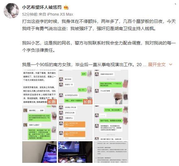 钱枫自去年吴某等一众明星被整治后,钱枫也不例外2021年8月24日,一位名叫“小艺希望坏人被惩罚”在各大平台发文表示自己曾做为天天向上的嘉宾,有被钱枫侵犯的经历
