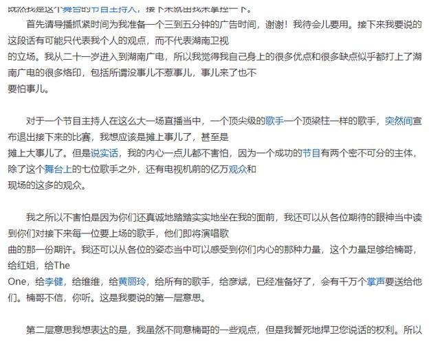 汪涵救场台词汪涵的情商也是不一般的高,汪涵说道“接下来的这段话,有可能只代表我个人的观点,而不代表湖南卫视的立场”完美的将所有的舆论压力全都压倒了自己的身上
