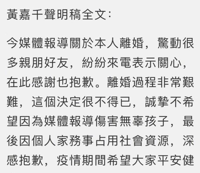 在收拾心情之后,黄嘉千发了简短的声明,表示“离婚过程非常艰难,这个决定很不得已,诚挚不希望因为媒体报道伤害无辜孩子”,还对个人家务事占用社会资源致歉。