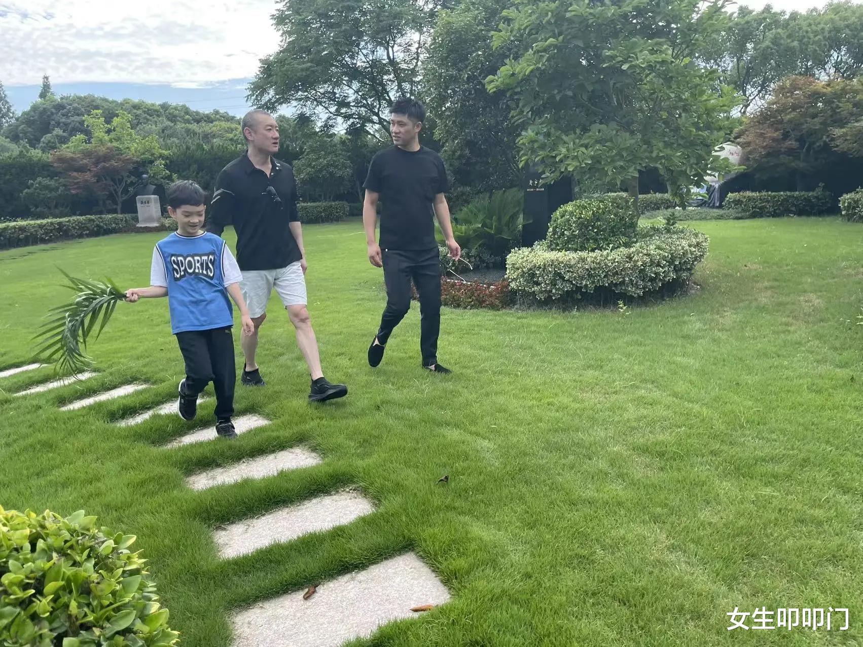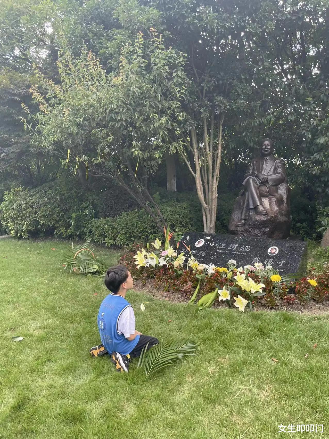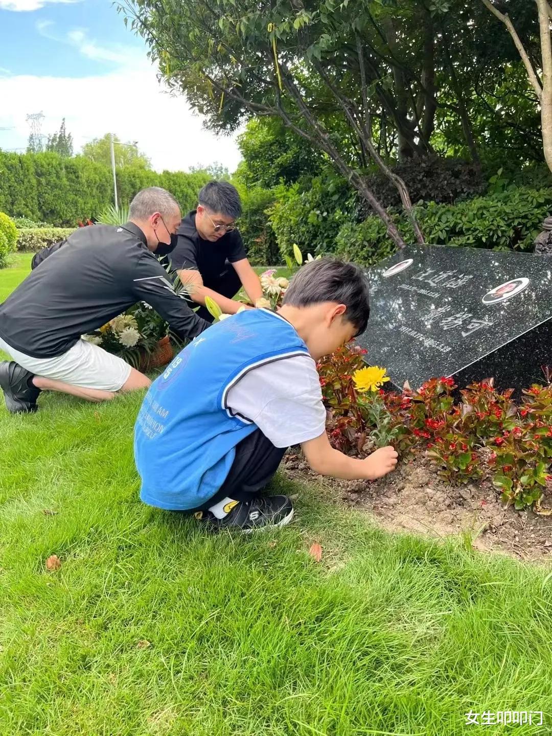 除了汪雨和朋友,同行还有一个穿着蓝色运动衫的小男孩。整个过程中,小男孩表现得十分毕恭毕敬,先是送鲜花,之后还跪在墓碑前。