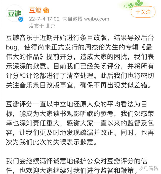 不过说两句倒还算小事,有些人甚至在他的专辑还未上线之际就在豆瓣上给差评,打低分。粉丝们看不过去,则是纷纷给出好评把分数拉回来,闹到最后豆瓣也出来向周杰伦道歉了,并关闭了评分通道。