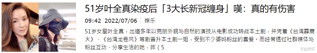 7月6日,据台媒报道,知名女星叶全真自曝确诊,康复后出现3大后遗症,让她忍不住感叹,原来伤害还是有的。