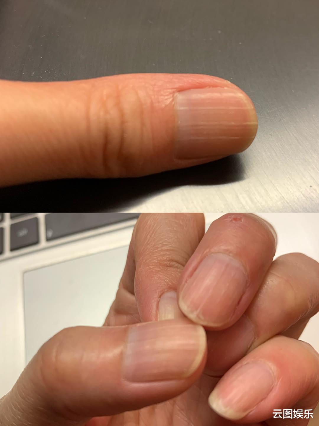 另外2张照片,则是她的手指特写照,在她的指甲上,能清晰看到很多裂痕。