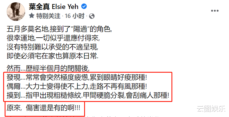 叶全真发文透露自己在5月份确诊了,一开始她的身体没有太多不适症状,一切似乎都应付得来。她感觉自己虽然染病了,但还算幸运。