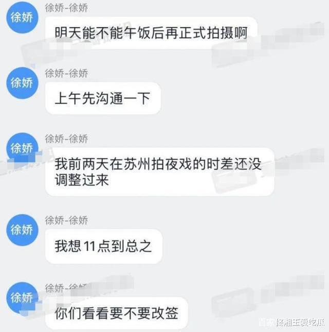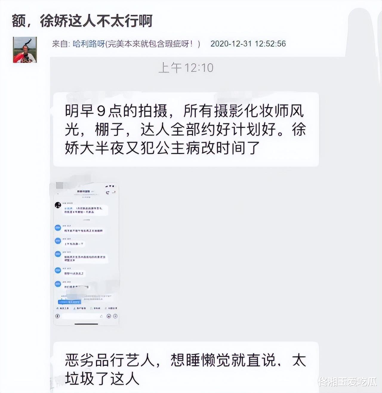 在前两年就有网友爆料,徐娇耍大牌,公主病严重,明明早就定好的工作,却临时“放鸽子”,给准备好一切的工作人员来了个措手不及,惹得工作人员直接在群里吐槽,“想睡懒觉就直说,太垃圾了”。