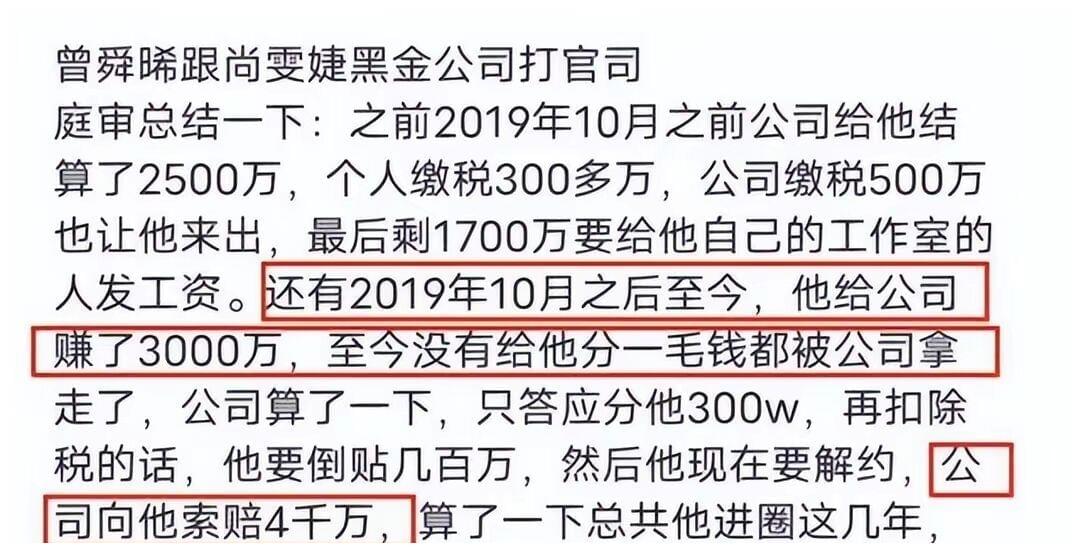 据悉,尚雯婕对曾舜晞很看重,给了不少资源,赚了不少的钱,但是黑金公司却没有给他该有的待遇,最后双方只能打官司。因为此事网友称在尚雯婕手下不死也要脱层皮。