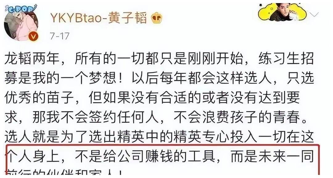 旗下的艺人王子腾,黄子韬给他找了《与君初相识》,还给他找了不少的资源,在他生日的时候为其庆生。听说黄子韬不让公司的艺人上酒桌谈工作,称他们是公司的合作伙伴,不是赚钱的工具,这么好的老板谁不爱呢。